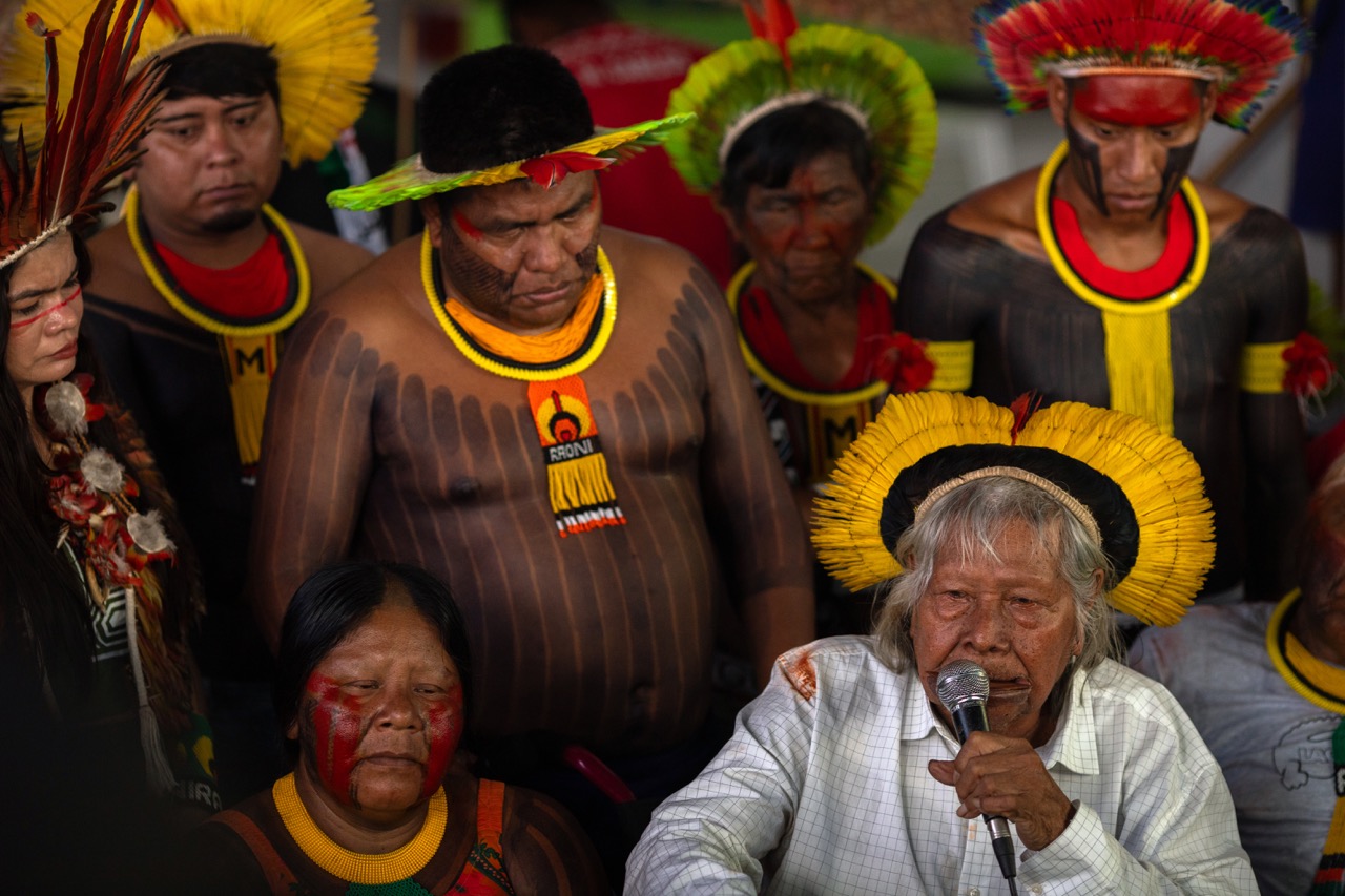 Raoni se pronuncia em Coletiva de Imprensa ao final na Barqueata, em Belém. Foto: Ahmad Jarrah. 12/11/2025.